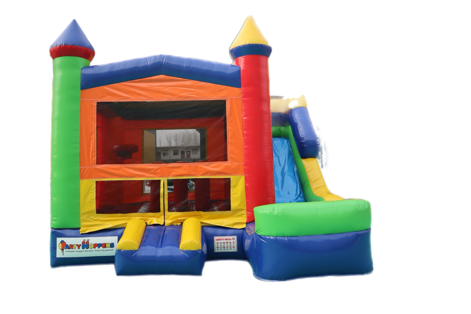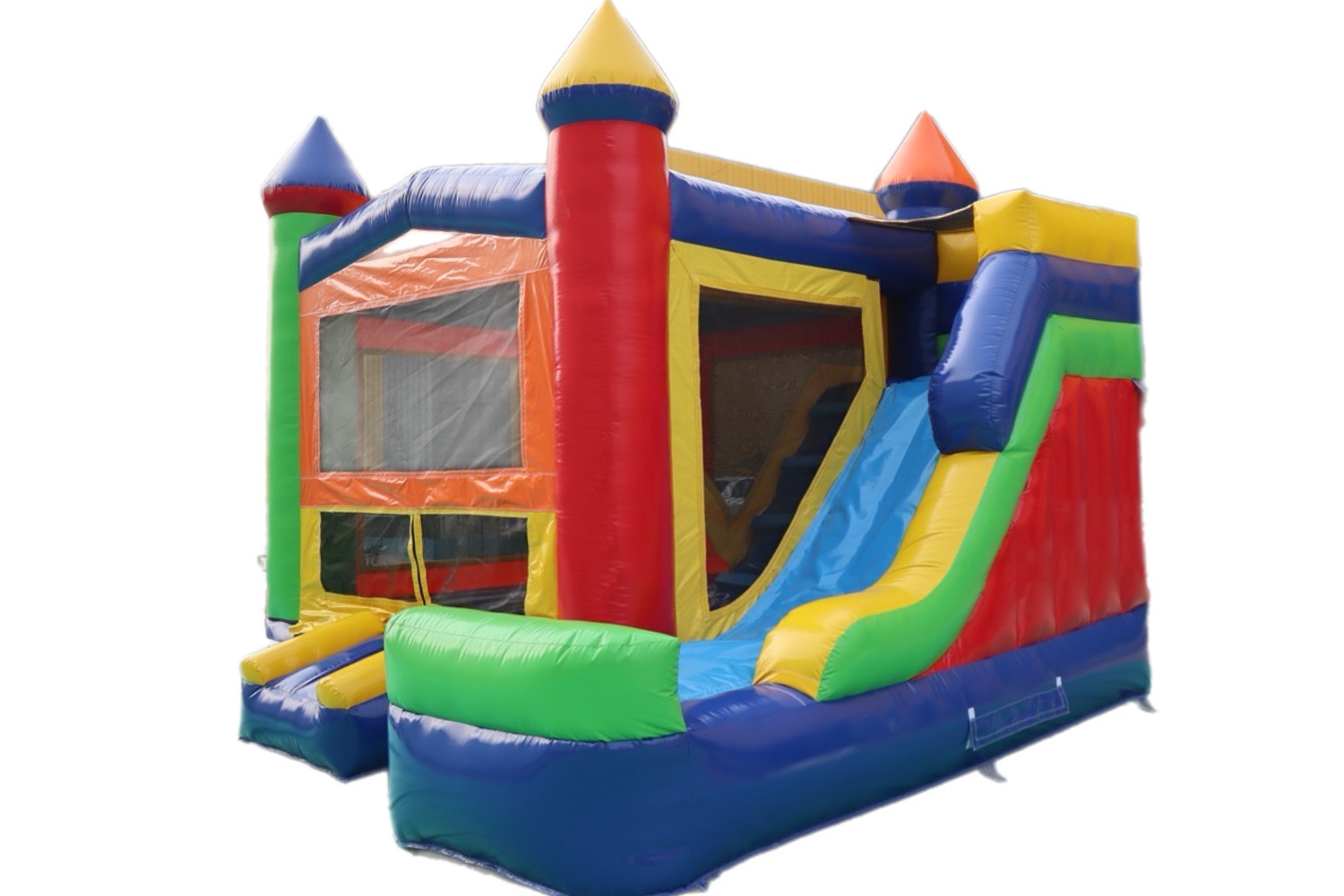 The Magic Combo is a vibrant, compact inflatable perfect for toddlers and younger kids! Designed with bright colors and a playful castle theme, it features a small bounce area, easy climb, and gentle dry slide